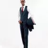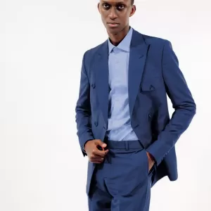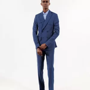 Indigo Blue Suit, 4-Button Double-Breasted Jacket, Peak Lapels, Buttoned Chest Tab, Flap Buttoned Chest Pocket, and Piped Side Pockets. Button-covered trousers with belt loops, slit side pockets, and welted back pockets.