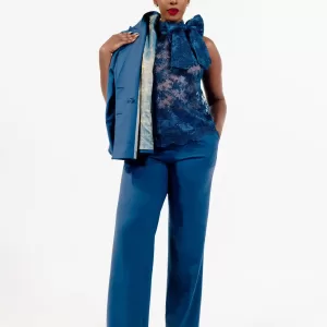 Indigo Blue Suit, 4-button Double-Breasted Jacket, Flap Pocket. Lace top with bow tie. First trousers with covered button, belt loops, and slit side pockets. Second trousers in lace.