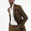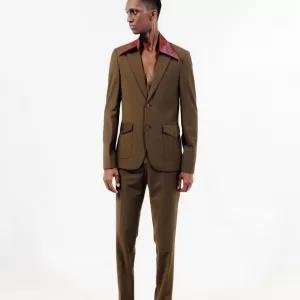 Costume Camel, Veste à double boutonnage, poche poitrine, poches latérales boutonnées et col en cachemire détachable. Pantalon à bouton recouvert, passant ceinture, poches latérales fendues, poche arrière passepoilées.