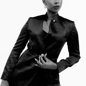 Suit Noir, veste asymétrique, bouton métal argenté sur le col et à la taille. Pantalon à bouton recouvert, passant ceinture, poches latérales fendues.