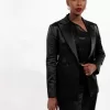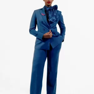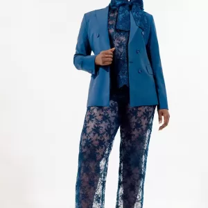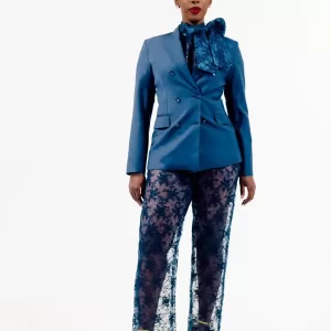 Suit Bleu indigo, veste croisé 4 boutons, poche à rabat. Top en dentelle nœud de papillon. 1 Pantalon à bouton recouvert, passant ceinture, poches latérales fendues. 1 pantalon en dentelle.