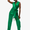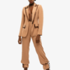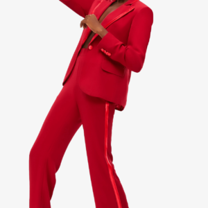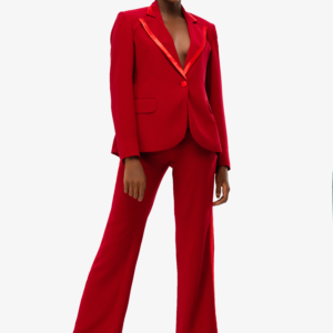 Ce charmant tailleur est composé d’une veste structurée avec des finitions en soie sur le revers et les boutons, accompagné d’un pantalon taille haute ajusté et fermé par une fermeture éclairs/invisible sur le côté avec des rayures latérales en soie.